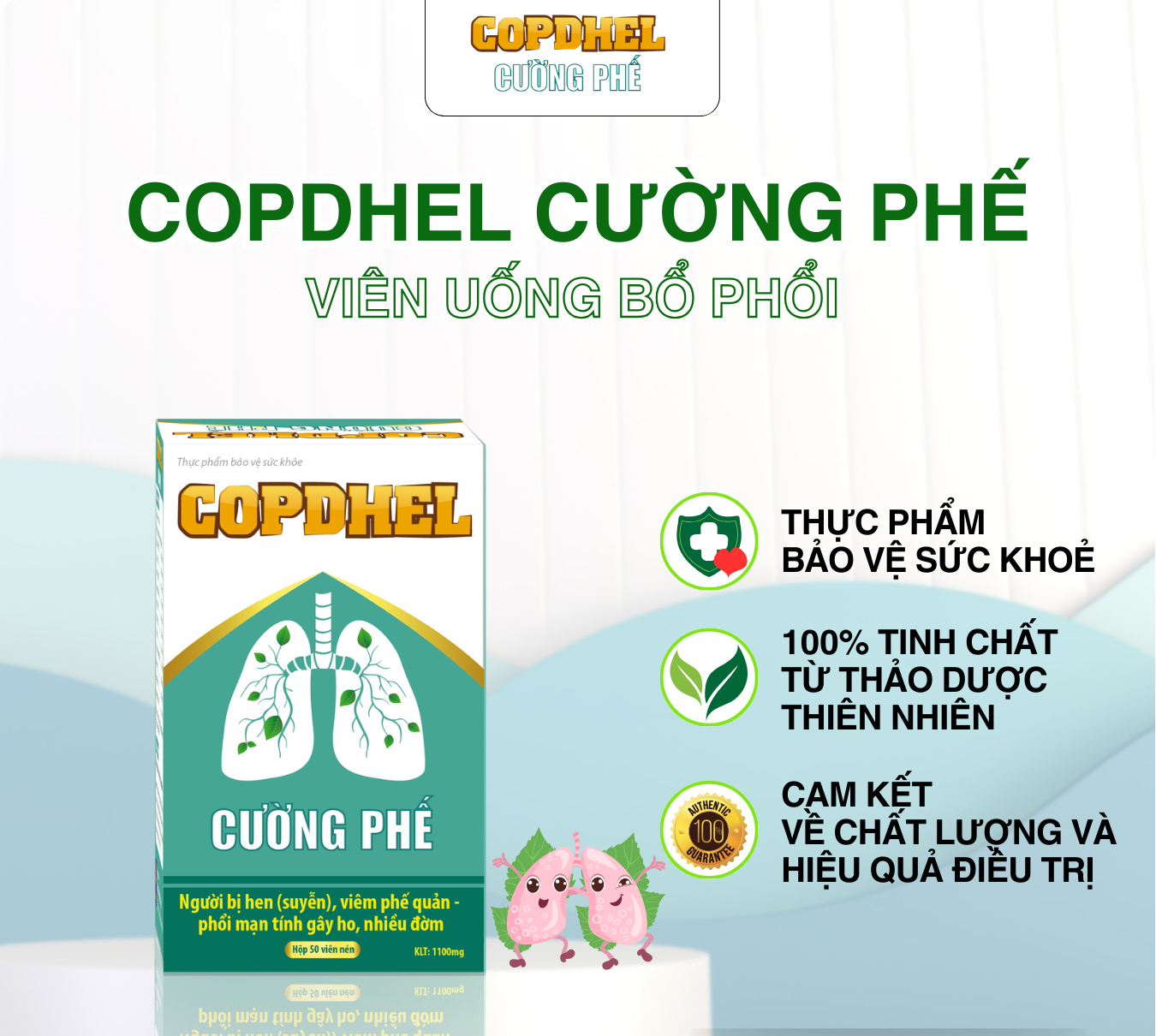 COPDHEL Cường Phế là sản phẩm chăm sóc sức khoẻ hô hấp tiên phong với công thức thảo dược phối phương ưu việt như lá hen, đông trùng hạ thảo, ngư tinh thảo, la bặc tử, bạch giới tử, xuyên bối mẫu, linh chi, cốt khỉ củ…